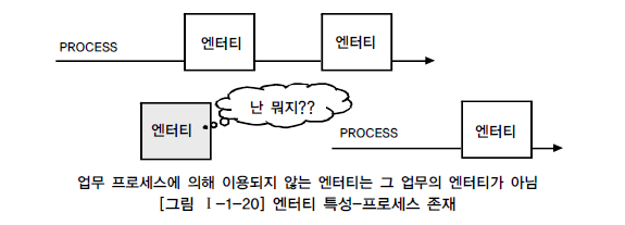 네 번째는 업무프로세스(Business Process)가 그 엔터티를 반드시 이용해야 한다는 점이다. 첫 번째 정의에서처럼 업무에서 반드시 필요하다고 생각하여 엔터티로 선정하였는데 업무프로세스에 의해 전혀 이용되지 않는다면 업무 분석이 정확하게 안되어 엔터티가 잘못 선정되거나 업무프로세스 도출이 적절하게 이루어지지 않았음을 의미한다. 이러한 경우는 데이터 모델링을 할 때 미처 발견하지 못하다가 프로세스 모델링을 하면서 데이터 모델과 검증을 하거나, 상관 모델링을 할 때 엔터티와 단위프로세스를 교차 점검하면서 문제점이 도출된다.