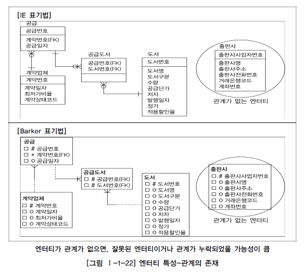 [그림 Ⅰ-1-20]과 같이 업무프로세스에 의해 CREATE, READ, UPDATE, DELETE 등이 발생하지 않는 고립된 엔터티의 경우는 엔터티를 제거하거나 아니면 누락된 프로세스가 존재하는지 살펴보고 해당 프로세스를 추가해야 한다.