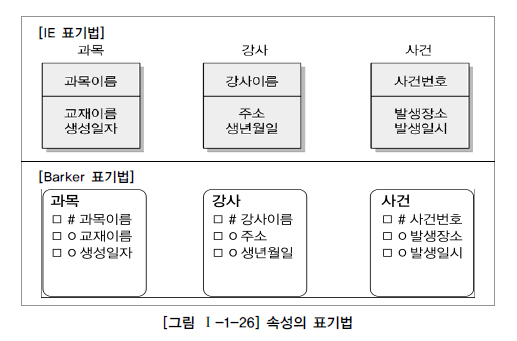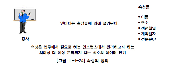 - 엔터티와 마찬가지로 반드시 해당 업무에서 필요하고 관리하고자 하는 정보이어야 한다. (예, 강사의 교재이름)