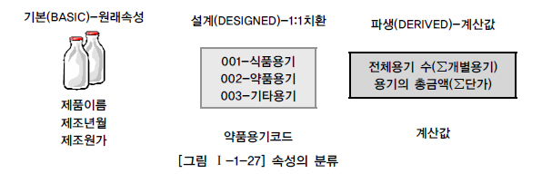 속성은 업무분석을 통해 바로 정의한 속성을 기본속성(Basic Attribute), 원래 업무상 존재하지는 않지만 설계를 하면서 도출해내는 속성을 설계속성(Designed Attribute), 다른 속성으로부터 계산이나 변형이 되어 생성되는 속성을 파생속성(Derived Attribute)이라고 한다.
