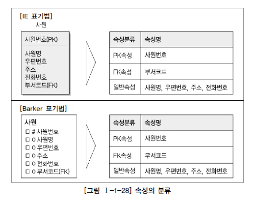 엔터티를 식별할 수 있는 속성을 PK(Primary Key)속성, 다른 엔터티와의 관계에서 포함된 속성을 FK(Foreign Key)속성, 엔터티에 포함되어 있고 PK, FK에 포함되지 않은 속성을 일반속성이라 한다.