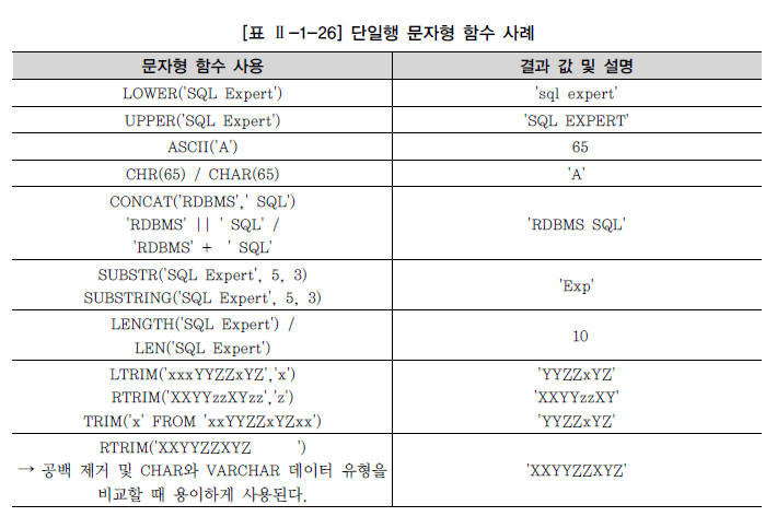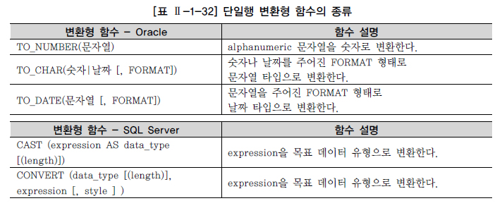 단일행 함수는 처리하는 데이터의 형식에 따라서 문자형, 숫자형, 날짜형, 변환형, NULL 관련 함수로 나눌 수 있다. 벤더에서 제공하는 내장 함수는 상당히 종류가 많고 벤더별로 사용법이 틀린 경우가 많아, 본 절에서는 Oracle과 SQL Server에서 공통으로 사용하는 중요 함수 위주로 설명을 한다. 함수에 대한 자세한 내용이나 버전에 따른 변경 내용은 벤더에서 제공하는 매뉴얼을 참조하기 바란다. 아래 함수의 예에서 SUBSTR / SUBSTRING으로 표시한 것은 같은 기능을 하지만 다르게 표현되는 Oracle 내장 함수와 SQL Server 내장 함수를 순서대로 표현한 것이다.