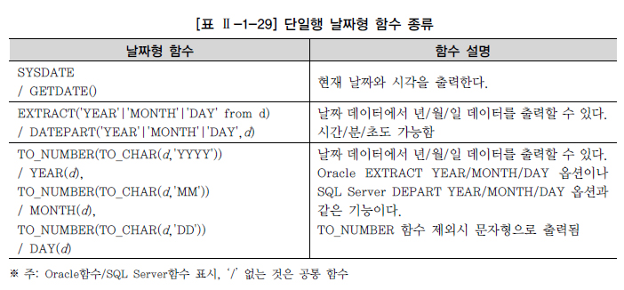 날짜형 함수는 DATE 타입의 값을 연산하는 함수이다. Oracle의 TO_NUMBER(TO_CHAR( )) 함수의 경우 변환형 함수로 구분할 수도 있으나 SQL Server의 YEAR, MONTH,DAY 함수와 매핑하기 위하여 날짜형 함수에서 설명한다. EXTRACT/DATEPART는 같은 기능을 하는 Oracle 내장 함수와 SQL Server 내장 함수를 표현한 것이다