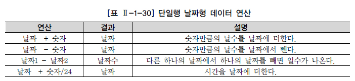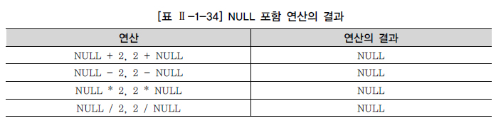 - 널 값을 포함하는 연산의 경우 결과 값도 널 값이다. 모르는 데이터에 숫자를 더하거나 빼도 결과는 마찬가지로 모르는 데이터인 것과 같다.