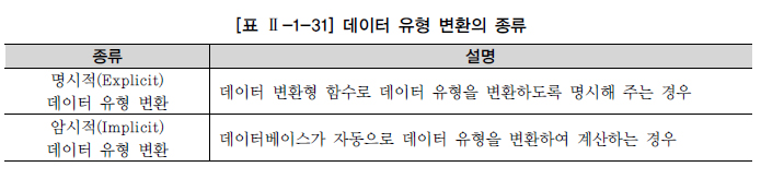 암시적 데이터 유형 변환의 경우 성능 저하가 발생할 수 있으며, 자동적으로 데이터베이스가 알아서 계산하지 않는 경우가 있어 에러를 발생할 수 있으므로 명시적인 데이터 유형 변환 방법을 사용하는 것이 바람직하다.