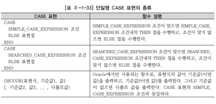 CASE 표현은 IF-THEN-ELSE 논리와 유사한 방식으로 표현식을 작성해서 SQL의 비교 연산 기능을 보완하는 역할을 한다. ANSI/ISO SQL 표준에는 CASE Expression이라고 표시되어 있는데, 함수와 같은 성격을 가지고 있으며 Oracle의 Decode 함수와 같은 기능을 하므로 단일행 내장 함수에서 같이 설명을 한다.