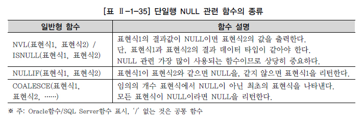 NVL/ISNULL 함수를 유용하게 사용하는 예는 산술적인 계산에서 데이터 값이 NULL일 경우이다. 칼럼 간 계산을 수행하는 경우 NULL 값이 존재하면 해당 연산 결과가 NULL 값이 되므로 원하는 결과를 얻을 수 없는 경우가 발생한다. 이런 경우는 NVL 함수?산을 해서 원하는 데이터를 얻는다. 관계형 데이터베이스의 중요한 데이터인 NULL을 처리하는 주요 함수는 다음과 같다.