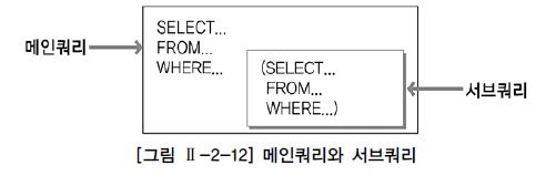 서브쿼리(Subquery)란 하나의 SQL문안에 포함되어 있는 또 다른 SQL문을 말한다. 서브쿼리는 알려지지 않은 기준을 이용한 검색을 위해 사용한다. 서브쿼리는 [그림 Ⅱ-2-12]와 같이 메인쿼리가 서브쿼리를 포함하는 종속적인 관계이다.