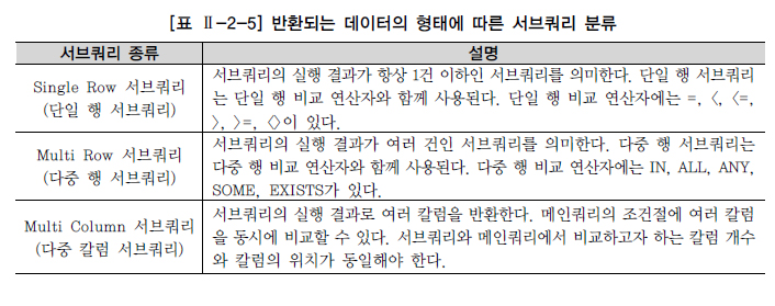 서브쿼리는 메인쿼리 안에 포함된 종속적인 관계이기 때문에 논리적인 실행순서는 항상 메인쿼리에서 읽혀진 데이터에 대해 서브쿼리에서 해당 조건이 만족하지를 확인하는 방식으로 수행되어야 한다. 그러나 실제 서브쿼리의 실행순서는 상황에 따라 달라질 수 있다. 반환되는 데이터의 형태에 따라 서브쿼리는 [표 Ⅱ-2-5]와 같이 세가지로 분류된다.