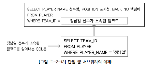 [그림 Ⅱ-2-13]은 2개의 SQL문으로 구성되어 있다. 정남일 선수의 소속팀을 알아내는 SQL문(서브쿼리 부분)과 이 결과를 이용해서 해당 팀에 소속된 선수들의 정보를 출력하는 SQL문(메인쿼리 부분)으로 구성된다. 정남일 선수가 소속된 팀의 선수들에 대한 정보를 표시하는 문제를 서브쿼리 방식의 SQL문으로 작성하면 다음과 같다.
