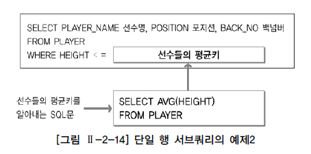 [그림 Ⅱ-2-14]는 2개의 SQL문으로 구성되어 있다. 선수들의 평균키를 알아내는 SQL문(서브쿼리 부분)과 이 결과를 이용해서 키가 평균 이하의 선수들의 정보를 출력하는 SQL문(메인쿼리 부분)으로 구성된다. [그림 Ⅱ-2-14]를 SQL문으로 작성하면 다음과 같다.
