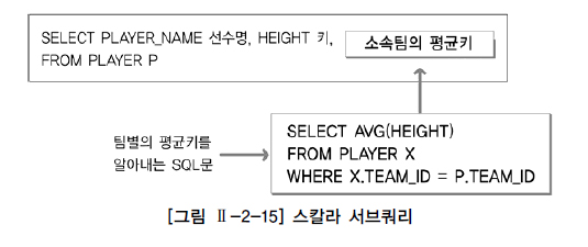 [그림 Ⅱ-2-15]는 2개의 SQL문으로 구성되어 있다. 선수들의 정보를 출력하는 SQL문(메인쿼리 부분)과 해당 선수의 소속팀별 평균키를 알아내는 SQL문(서브쿼리 부분)으로 구성된다. 여기서 선수의 소속팀별 평균키를 알아내는 스칼라 서브쿼리는 메인쿼리의 결과 건수만큼 반복수행 된다. [그림 Ⅱ-2-15]를 SQL문으로 작성하면 다음과 같다.
