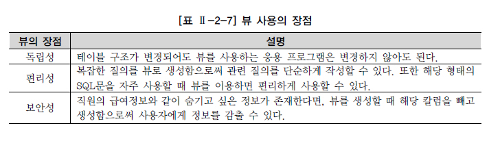 테이블은 실제로 데이터를 가지고 있는 반면, 뷰(View)는 실제 데이터를 가지고 있지 않다. 뷰는 단지 뷰 정의(View Definition)만을 가지고 있다. 질의에서 뷰가 사용되면 뷰 정의를 참조해서 DBMS 내부적으로 질의를 재작성(Rewrite)하여 질의를 수행한다. 뷰는 실제 데이터를 가지고 있지 않지만 테이블이 수행하는 역할을 수행하기 때문에 가상 테이블(Virtual Table)이라고도 한다. 뷰는 [표 Ⅱ-2-7]과 같은 장점을 갖는다.