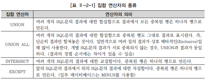 집합 연산자는 개별 SQL문의 결과 집합에 대해 합집합(UNION/UNION ALL), 교집합(INTERSECT), 차집합(EXCEPT)으로 집합간의 관계를 가지고 작업을 한다.