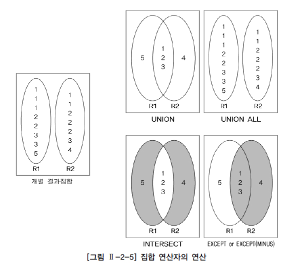 집합 연산자를 가지고 연산한 결과는 [그림 Ⅱ-2-5]와 같다. [그림 Ⅱ-2-5]의 왼쪽에 존재하는 R1, R2는 각각의 SQL문을 실행해서 생성된 개별 결과 집합을 의미한다. [그림 Ⅱ-2-5]에서 보면 알 수 있듯이 UNION ALL을 제외한 다른 집합 연산자에서는 SQL문의 결과 집합에서 먼저 중복된 건을 배제하는 작업을 수행한 후에 집합 연산을 적용한다(논리적인 관점의 처리임). UNION 연산에서 R1 = {1, 2, 3, 5}, R2 = {1, 2, 3, 4}가 되고, 이것의 합집합(R1 ∪ R2)의 결과는 {1, 2, 3, 4, 5}이다. UNION ALL 연산은 중복에 대한 배제 없이 2개의 결과 집합을 단순히 합친 것과 동일한 결과이다. UNION ALL의 결과는 {1, 1, 1, 2, 2, 3, 3, 5, 1, 1, 2, 2, 2, 3, 4}이다. INTERSECT 연산에서 R1 = {1, 2, 3, 5}, R2 = {1, 2, 3, 4}가 되어, 이것의 교집합(R1 ∩ R2)의 결과는 {1, 2, 3}이다. EXCEPT 연산에서는 R1 = {1, 2, 3, 5}, R2 = {1, 2, 3, 4}가 되고, 이것의 차집합(R1 R2)의 결과는 {5}이다. EXCEPT 연산에서는 순서가 중요하다. 만약 순서가 바뀌어서 R2 R1의 차집합이었다면 결과는 {4}가 된다. 집합 연산자를 사용하여 만들어지는 SQL문의 형태는 다음과 같다.
