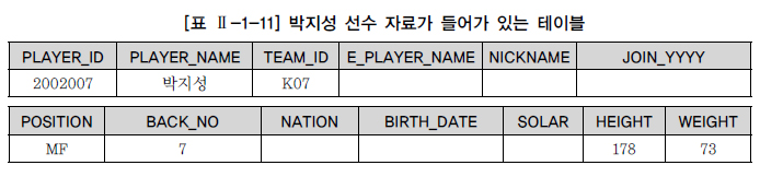 [표 Ⅱ-1-11]은 데이터베이스 내에 있는 PLAYER 테이블에 박지성 선수 정보가 입력되어 있는 것을 나타낸 것이다. INSERT 문장에서 BACK_NO가 마지막에 정의가 되었더라도 테이블에는 칼럼 순서대로 데이터가 입력되었다. 칼럼명이 정의되지 않은 경우 NULL 값이 입력되었다.