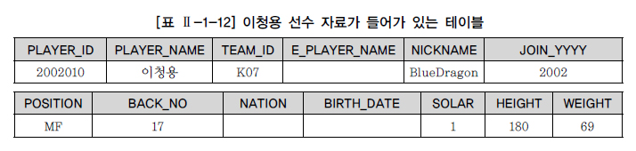 데이터를 입력하는 경우 정의되지 않은 미지의 값인 E_PLAYER_NAME은 두 개의 『 ‘’ 』SINGLE QUOTATION을 붙여서 표현하거나, NATION이나 BIRTH_DATE의 경우처럼 NULL이라고 명시적으로 표현할 수 있다.