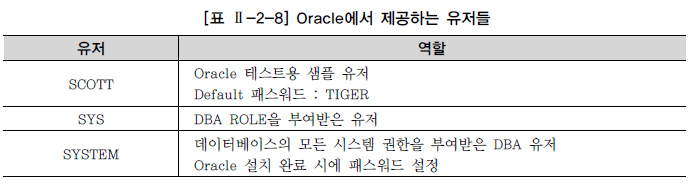 다른 부서 간에 또는 다른 회사 간에 데이터를 공유하기 위해 데이터베이스를 오픈해야 하는 경우가 가끔 발생한다. 물론 데이터베이스를 오픈하는 것 자체가 문제가 될 수 있다. 즉 운영 시스템에서 사용하던 유저를 오픈하면 데이터의 손실 우려가 너무 커지게 되는 것이다. 이런 경우에 새로운 유저를 생성하고, 생성한 유저에게 공유할 테이블이나 기타 오브젝트에 대한 접근 권한만을 부여한다면 문제는 쉽게 해결할 수 있다. 일반적으로 회원제 웹사이트를 방문하여 서비스를 이용하려면 먼저 회원 가입을 해야 한다. 유저 아이디, 패스워드, 기타 개인정보를 입력하고 약관에 동의하면 회원 가입이 된다. 그리고 유저 아이디와 패스워드로 로그인하면 웹사이트의 서비스를 이용할 수 있게 된다. 그러나 영화나 유료 게임과 같은 특정 컨텐츠를 이용하려면 ‘권한이 없다’라는 메시지를 볼 수 있다. 여기서 유저 아이디와 패스워드를 유저라 할 수 있고, 유료 서비스에 대한 결재 여부를 권한이라 할 수 있다. 대부분의 데이터베이스는 데이터 보호와 보안을 위해서 유저와 권한을 관리하고 있는데, 예를 들어 Oracle을 설치하면 기본적으로 제공되는 유저들인 SYS, SYSTEM, SCOTT 유저에 대해서 [표 Ⅱ-2-8]을 통해서 간단하게 알아본다.