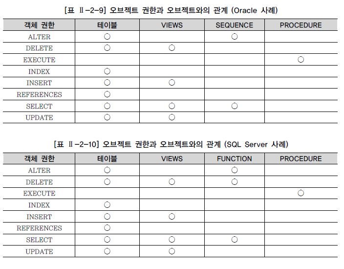 앞에서 PJS 유저를 생성하여 로그인하고 테이블을 만드는 과정에서 몇 가지의 권한에 대해서 살펴보았다. 이제는 특정 유저가 소유한 객체(OBJECT) 권한에 대해 알아본다. 오브젝트 권한은 특정 오브젝트인 테이블, 뷰 등에 대한 SELECT, INSERT, DELETE, UPDATE 작업 명령어를 의미한다. [표 Ⅱ-2-9]는 오브젝트 권한과 오브젝트와의 관계를 보여 주고 있다.