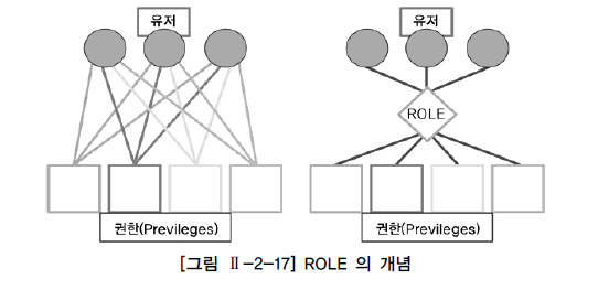 유저를 생성하면 기본적으로 CREATE SESSION, CREATE TABLE, CREATE PROCEDURE 등 많은 권한을 부여해야 한다. 데이터베이스 관리자는 유저가 생성될 때마다 각각의 권한들을 유저에게 부여하는 작업을 수행해야 하며 간혹 권한을 빠뜨릴 수도 있으므로 각 유저별로 어떤 권한이 부여되었는지를 관리해야 한다. 하지만 관리해야 할 유저가 점점 늘어나고 자주 변경되는 상황에서는 매우 번거로운 작업이 될 것이다. 이와 같은 문제를 줄이기 위하여 많은 데이터베이스에서 유저들과 권한들 사이에서 중개 역할을 하는 ROLE을 제공한다. 데이터베이스 관리자는 ROLE을 생성하고, ROLE에 각종 권한들을 부여한 후 ROLE을 다른 ROLE이나 유저에게 부여할 수 있다. 또한 ROLE에 포함되어 있는 권한들이 필요한 유저에게는 해당 ROLE만을 부여함으로써 빠르고 정확하게 필요한 권한을 부여할 수 있게 된다. [그림 Ⅱ-2-17]에서는 유저들과 권한들 사이 간 ROLE의 역할을 보여 주고 있다. 왼쪽 그림은 권한을 직접 유저에게 할당할 때를 나타내는 것이며, 오른쪽 그림은 ROLE에 권한을 부여한 후 ROLE을 유저들에게 부여하는 것을 나타내고 있다.