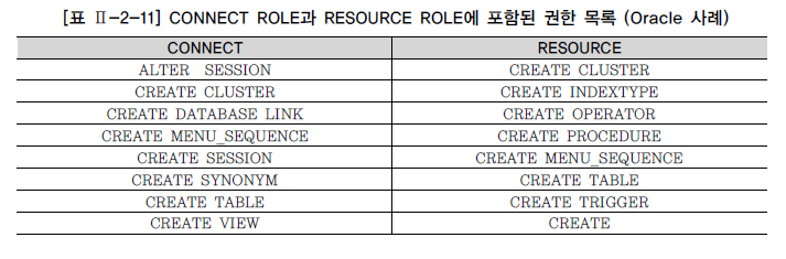 이와 같이 ROLE을 만들어 사용하는 것이 권한을 직접 부여하는 것보다 빠르고 안전하게 유저를 관리할 수 있는 방법이다. Oracle에서는 기본적으로 몇 가지 ROLE을 제공하고 있다. 그 중 가장 많이 사용하는 ROLE은 CONNECT와 RESOURCE이다. 참조를 위해 [표 Ⅱ-2-11]은 CONNECT와 RESOURCE ROLE에 부여된 권한 목록을 정리한 것이다. CONNECT는 CREATE SESSION과 같은 로그인 권한이 포함되어 있고, RESOURCE는 CREATE TABLE과 같은 오브젝트의 생성 권한이 포함되어 있다. 일반적으로 유저를 생성할 때 CONNECT와 RESOURCE ROLE을 사용하여 기본 권한을 부여한다.