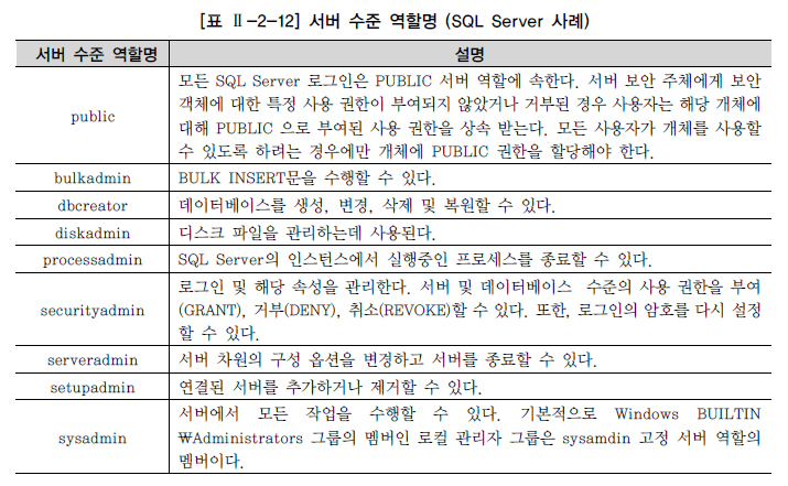 SQL Server에서는 위와 같이 ROLE을 생성하여 사용하기보다는 기본적으로 제공되는 ROLE에 멤버로 참여하는 방식으로 사용한다. 특정 로그인이 멤버로 참여할 수 있는 서버 수준 역할(ROLE)은 [표 Ⅱ-2-12]와 같다.