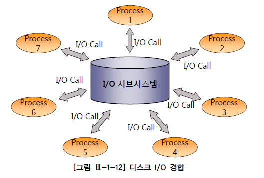 디스크를 경유한 데이터 입출력은 디스크의 액세스 암(Arm)이 움직이면서 헤드를 통해 데이터를 읽고 쓰기 때문에 느린 반면, 메모리를 통한 입출력은 전기적 신호에 불과하기 때문에 디스크를 통한 I/O에 비해 비교할 수 없을 정도로 빠르다. 모든 DBMS는 읽고자 하는 블록을 먼저 버퍼 캐시에서 찾아보고, 없을 경우에만 디스크에서 읽어 버퍼 캐시에 적재한 후 읽기/쓰기 작업을 수행한다. 물리적인 디스크 I/O가 필요할 때면 서버 프로세스는 시스템에 I/O Call을 하고 잠시 대기 상태에 빠진다. 디스크 I/O 경합이 심할수록 대기 시간도 길어진다. ([그림 Ⅲ-1-12] 참조)