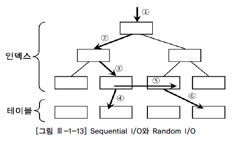 Sequential 액세스는 레코드간 논리적 또는 물리적인 순서를 따라 차례대로 읽어 나가는 방식이다. 인덱스 리프 블록에 위치한 모든 레코드는 포인터를 따라 논리적으로 연결돼 있고, 이 포인터를 따라 스캔하는 것([그림 Ⅲ-1-13]에서 ⑤번)은 Sequential 액세스 방식이다. 테이블 레코드 간에는 포인터로 연결되지 않지만 테이블을 스캔할 때는 물리적으로 저장된 순서대로 읽어 나가므로 이것 또한 Sequential 액세스 방식이다. random 액세스는 레코드간 논리적, 물리적인 순서를 따르지 않고, 한 건을 읽기 위해 한 블록씩 접근하는 방식을 말한다.([그림 Ⅲ-1-13]에서 ①, ②, ③, ④, ⑥번) 블록 단위 I/O를 하더라도 한번 액세스할 때 Sequential 방식으로 그 안에 저장된 모든 레코드를 읽는다면 비효율은 없다. 반면, 하나의 레코드를 읽으려고 한 블록씩 random 액세스한다면 매우 비효율적이라고 할 수 있다. 여기서 I/O튜닝의 핵심 원리 두 가지를 발견할 수 있다.