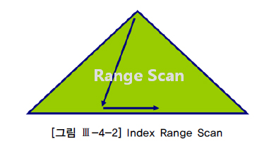 Index Range Scan은 [그림 Ⅲ-4-2]처럼 인덱스 루트 블록에서 리프 블록까지 수직적으로 탐색한 후에 리프 블록을 필요한 범위(Range)만 스캔하는 방식이다.