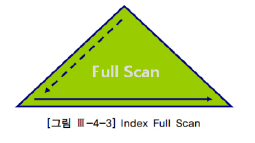 Index Full Scan은 수직적 탐색없이 인덱스 리프 블록을 처음부터 끝까지 수평적으로 탐색하는 방식으로서, 대개는 데이터 검색을 위한 최적의 인덱스가 없을 때 차선으로 선택된다.
