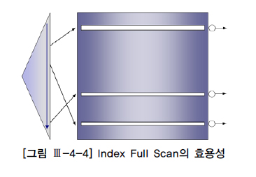 [그림 Ⅲ-4-4]처럼 연봉이 5,000을 초과하는 사원이 전체 중 극히 일부라면 Table Full Scan보다는 Index Full Scan을 통한 필터링이 큰 효과를 가져다준다. 하지만 이런 방식은 적절한 인덱스가 없어 Index Range Scan의 차선책으로 선택된 것이므로, 할 수 있다면 인덱스 구성을 조정해 주는 것이 좋다.