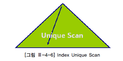 Index Unique Scan은 [그림 Ⅲ-4-6]처럼 수직적 탐색만으로 데이터를 찾는 스캔 방식으로서, Unique 인덱스를 ‘=’ 조건으로 탐색하는 경우에 작동한다.