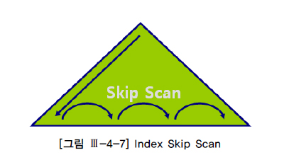 인덱스 선두 칼럼이 조건절로 사용되지 않으면 옵티마이저는 기본적으로 Table Full Scan을 선택한다. 또는, Table Full Scan보다 I/O를 줄일 수 있거나 정렬된 결과를 쉽게 얻을 수 있다면 Index Full Scan 방식을 사용한다고 했다. Oracle은 인덱스 선두 칼럼이 조건절에 빠졌어도 인덱스를 활용하는 새로운 스캔방식을 9i 버전에서 선보였는데, 바로 Index Skip Scan이 그것이다.([그림 Ⅲ-4-7] 참조).