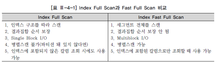 말 그대로 Index Fast Full Scan은 Index Full Scan보다 빠르다. Index Fast Full Scan이 Index Full Scan보다 빠른 이유는, 인덱스 트리 구조를 무시하고 인덱스 세그먼트 전체를 Multiblock Read 방식으로 스캔하기 때문이다. Index Full Scan과의 차이점을 요약하면 [표 Ⅲ-4-1]과 같다.