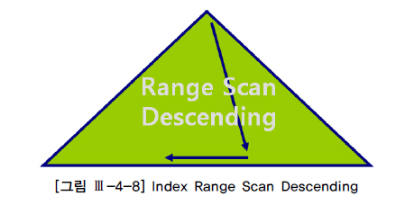 Index Range Scan과 기본적으로 동일한 스캔 방식이다. [그림 Ⅲ-4-8]처럼 인덱스를 뒤에서부터 앞쪽으로 스캔하기 때문에 내림차순으로 정렬된 결과집합을 얻는다는 점만 다르다.