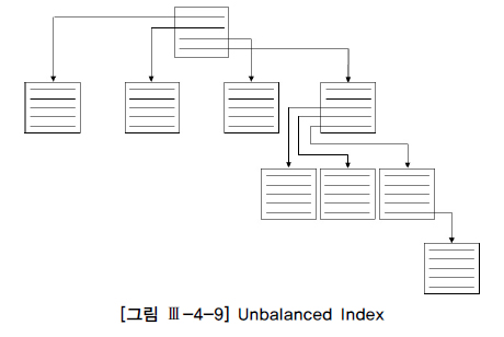DELETE 작업 때문에 인덱스가 [그림 Ⅲ-4-9]처럼 불균형(Unbalanced) 상태에 놓일 수 있다고 설명한 자료들을 볼 수 있다. 즉 다른 리프 노드에 비해 루트 블록과의 거리가 더 멀거나 가까운 리프 노드가 생길 수 있다는 것인데, B*Tree 구조에서 이런 현상은 절대 발생하지 않는다.