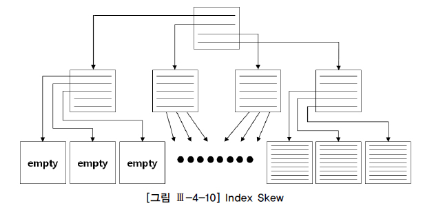 불균형(Unbalanced)은 생길 수 없지만 Index Fragmentation에 의한 Index Skew 또는 Sparse 현상이 생기는 경우는 종종 있고, 이는 인덱스 스캔 효율에 나쁜 영향을 미칠 수 있다. Index Skew는 인덱스 엔트리가 왼쪽 또는 오른쪽에 치우치는 현상을 말한다. 예를 들어, 아래와 같이 대량의 DELETE 작업을 마치고 나면 [그림 Ⅲ-4-10]처럼 인덱스 왼쪽에 있는 리프 블록들은 텅 비는 반면 오른쪽은 꽉 찬 상태가 된다.
