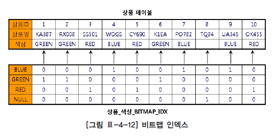 Oracle은 비트맵(Bitmap) 인덱스 구조를 제공하며, [그림 Ⅲ-4-12]를 보면 그 구조를 쉽게 이해할 수 있다. [그림 Ⅲ-4-12] 처럼 상품 테이블에 10개 레코드가 있고, 색상으로는 RED, GREEN, BLUE가 입력돼 있다고 하자. 8번 상품에는 색상이 입력되지 않았다.