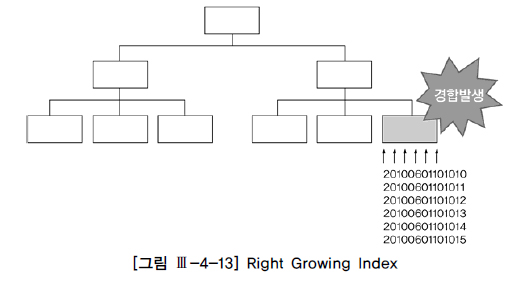 일련번호나 주문일시 같은 칼럼에 인덱스를 만들면, 입력되는 값이 순차적으로 증가하기 때문에 [그림 Ⅲ-4-13]처럼 가장 오른쪽 리프 블록에만 데이터가 쌓인다. 이런 현상이 발생하는 인덱스를 흔히 ‘Right Growing(또는 Right HAND) 인덱스’라고 부르며, 동시 INSERT가 심할 때 인덱스 블록 경합을 일으켜 초당 트랜잭션 처리량을 크게 감소시킨다.