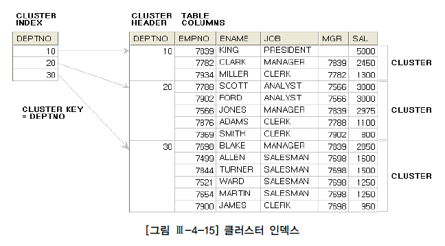 Oracle에는 클러스터 테이블(Clustered Table)이라는 오브젝트가 있다. 클러스터 테이블에는 인덱스 클러스터와 해시 클러스터 두 가지가 있는데, 지금 설명하려는 클러스터 인덱스는 인덱스 클러스터와 관련이 있다. 인덱스 클러스터 테이블은 [그림 Ⅲ-4-15]처럼 클러스터 키(여기서는 deptno) 값이 같은 레코드가 한 블록에 모이도록 저장하는 구조를 사용한다. 한 블록에 모두 담을 수 없을 때는 새로운 블록을 할당해 클러스터 체인으로 연결한다.