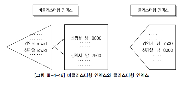 클러스터형 인덱스도 구조적으로는 B*Tree 인덱스와 같은 형태다. 차이가 있다면 별도의 테이블을 생성하지 않고 모든 행 데이터를 인덱스 리프 페이지에 저장한다는 점이다. [그림 Ⅲ-4-16] 우측에서 보듯, “인??.