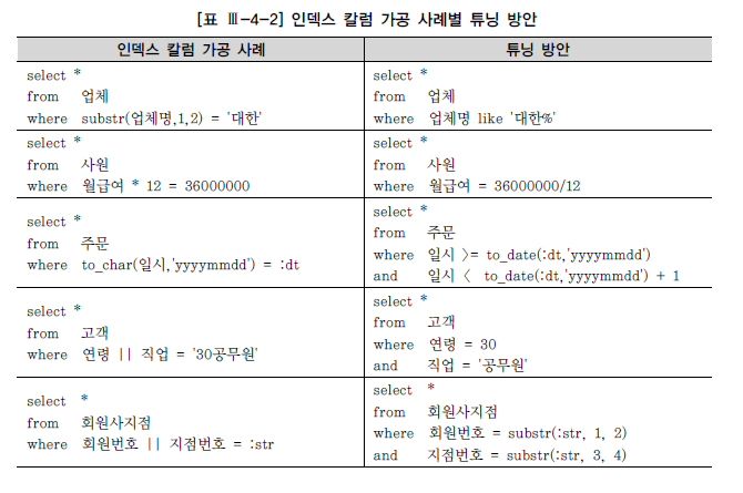 인덱스 칼럼을 가공하면 정상적인 Index Range Scan이 불가능해진다고 했다. 가장 흔한 인덱스 칼럼 가공 사례는 [표 Ⅲ-4-2]와 같고, 오른쪽 칼럼은 각 사례에 대한 튜닝 방안이다.