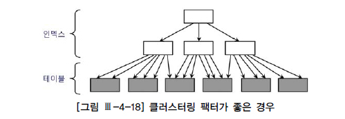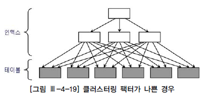 테이블에는 데이터가 무작위로 입력되는 반면, 그것을 가리키는 인덱스는 정해진 키(key) 순으로 정렬되기 때문에 대개 클러스터링 팩터가 좋지 않게 마련이다. 필자의 경험에 의하면, 클러스터링 팩터가 나쁜 인덱스를 이용해 많은 양의 데이터를 읽는 SQL 튜닝하기가 가장 어렵다. 그럴 때, 해당 인덱스 기준으로 테이블을 재생성함으로써 클러스터링 팩터를 인위적으로 좋게 만드는 방법을 생각해 볼 수 있고, 실제 그렇게 했을 때 나타나는 효과는 매우 극적이다. 주의할 것은, 인덱스가 여러 개인 상황에서 특정 인덱스를 기준으로 테이블을 재정렬하면 다른 인덱스의 클러스터링 팩터가 나빠질 수 있다는 점이다. 다행히 두 인덱스 키 칼럼 간에 상관관계가 높다면(예를 들어, 직급과 급여) 두 개 이상 인덱스의 클러스터링 팩터가 동시에 좋아질 수 있지만, 그런 경우를 제외하면 대개 클러스터링 팩터가 좋은 인덱스는 테이블당 하나뿐이다. 따라서 인위적으로 클러스터링 팩터를 높일 목적으로 테이블을 Reorg 할 때는 가장 자주 사용되는 인덱스를 기준으로 삼아야 하며, 혹시 다른 인덱스를 사용하는 중요한 쿼리 성능에 나쁜 영향을 주지 않는지 반드시 체크해 봐야 한다. 그리고 이 작업을 주기적으로 수행하려면 데이터베이스 관리 비용이 증가하고 가용성에도 영향을 미치므로 테이블과 인덱스를 Rebuild하는 부담이 적고 그 효과가 확실할 때만 사용하는 것이 바람직하다.