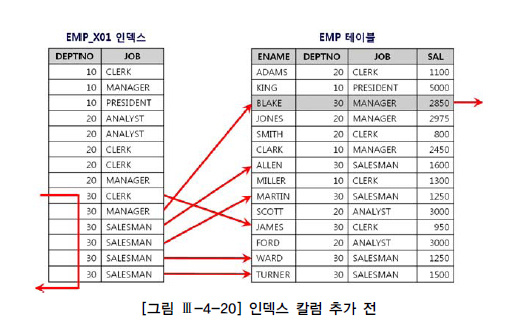 [그림 Ⅲ-4-20]을 보면 위 조건을 만족하는 사원이 단 한 명뿐인데, 이를 찾기 위해 테이블 액세스는 6번 발생하였다.