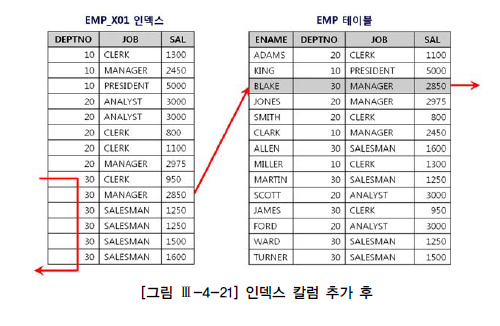 할 수 없이 인덱스를 새로 만들어야겠지만 이런 식으로 인덱스를 추가하다 보면 테이블마다 인덱스가 수십 개씩 달려 배보다 배꼽이 더 커지게 된다. 이럴 때, [그림 Ⅲ-4-21]처럼 기존 인덱스에 sal 칼럼을 추가하는 것만으로 큰 효과를 거둘 수 있다. 인덱스 스캔량은 줄지 않지만 테이블 random 액세스 횟수를 줄여주기 때문이다.