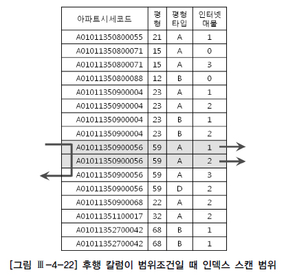 인덱스 선두 칼럼인 인터넷매물에 between 연산자를 사용하면 나머지 조건(아파트시세코드=’A01011350900056’ AND 평형 = ‘59’ AND 평형타입 = ‘A’)을 만족하는 레코드들이 인터넷매물 값(0, 1, 2, 3)별로 뿔뿔이 흩어져 있게 된다. 따라서 조건을 만족하지 않는 레코드까지 스캔하고서 버려야 하는 비효율이 생긴다.