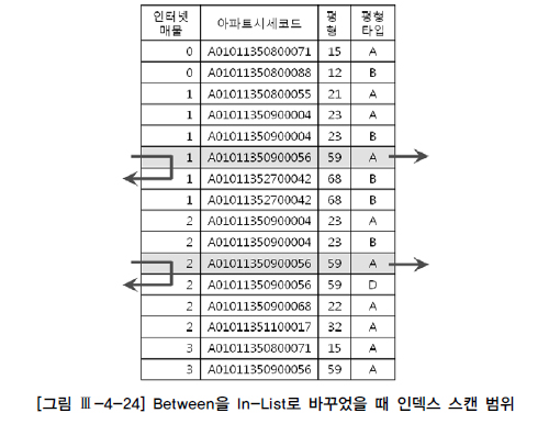 [그림 Ⅲ-4-24]는 between 조건을 IN-List로 바꾸었을 때의 스캔 과정을 도식화한 것이다.