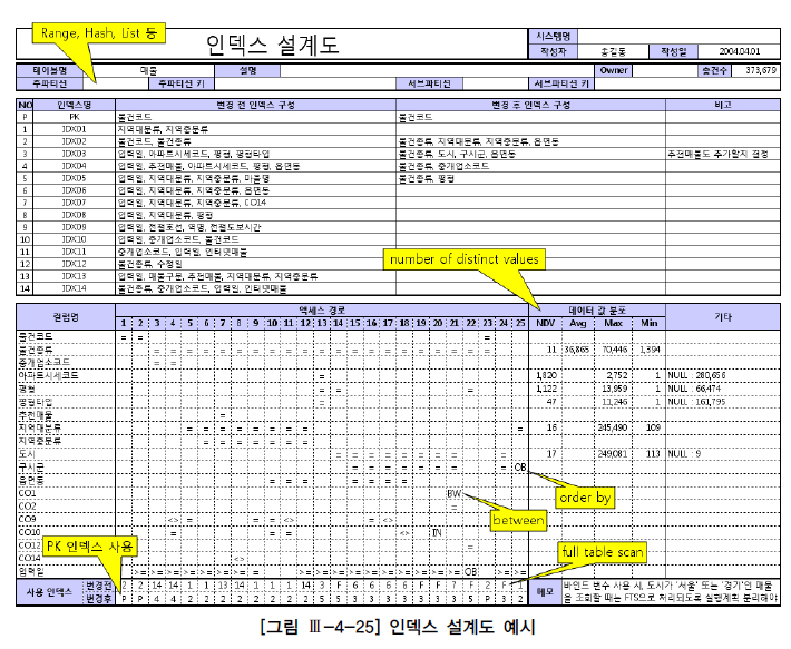 앞에서도 얘기했듯이 인덱스 설계 시 시스템 전체 효율을 고려해야 한다. 조화를 이룬 건축물을 짓기 위해 설계도가 필수인 것처럼 인덱스 설계 시에도 전체를 조망할 수 있는 설계도면이 필요한 이유다. [그림 Ⅲ-4-25]는 인덱스 설계도를 예시한 것이다.