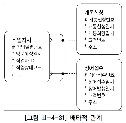 어떤 엔터티가 두 개 이상의 다른 엔터티의 합집합과 관계(Relationship)를 갖는 것을 ‘상호배타적(Exclusive OR) 관계’라고 한다. [그림 Ⅲ-4-31]에서 작업지시 테이블과 개통신청 및 장애접수 테이블과의 관계가 여기에 해당하며, 관계선에 표시된 아크(Arc)를 확인하기 바란다.