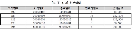 SELECT 연체개월수 , 연체금액 FROM 고객별연체금액 WHERE 고객번호 = :cust_num AND 종료일자 = '99991231'